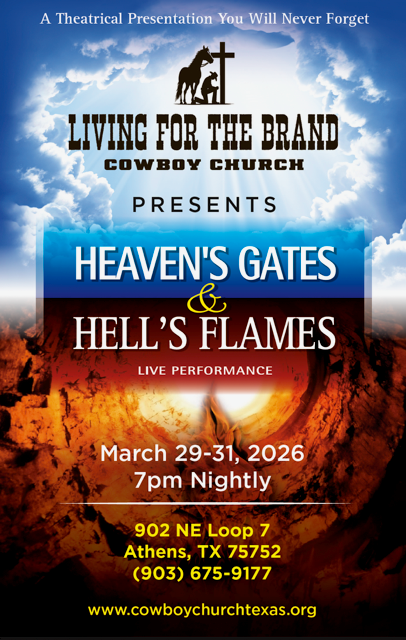 Living for the Brand Cowboy Church presents 'Heaven's Gates & Hell's Flames' Live Performance. A Theatrical Presentation you will never forget. March 29-31, 2026, 7pm nightly. 902 NE Loop 7, Athens, TX 75752 (903) 675-9177 www.cowboychurchtexas.org |