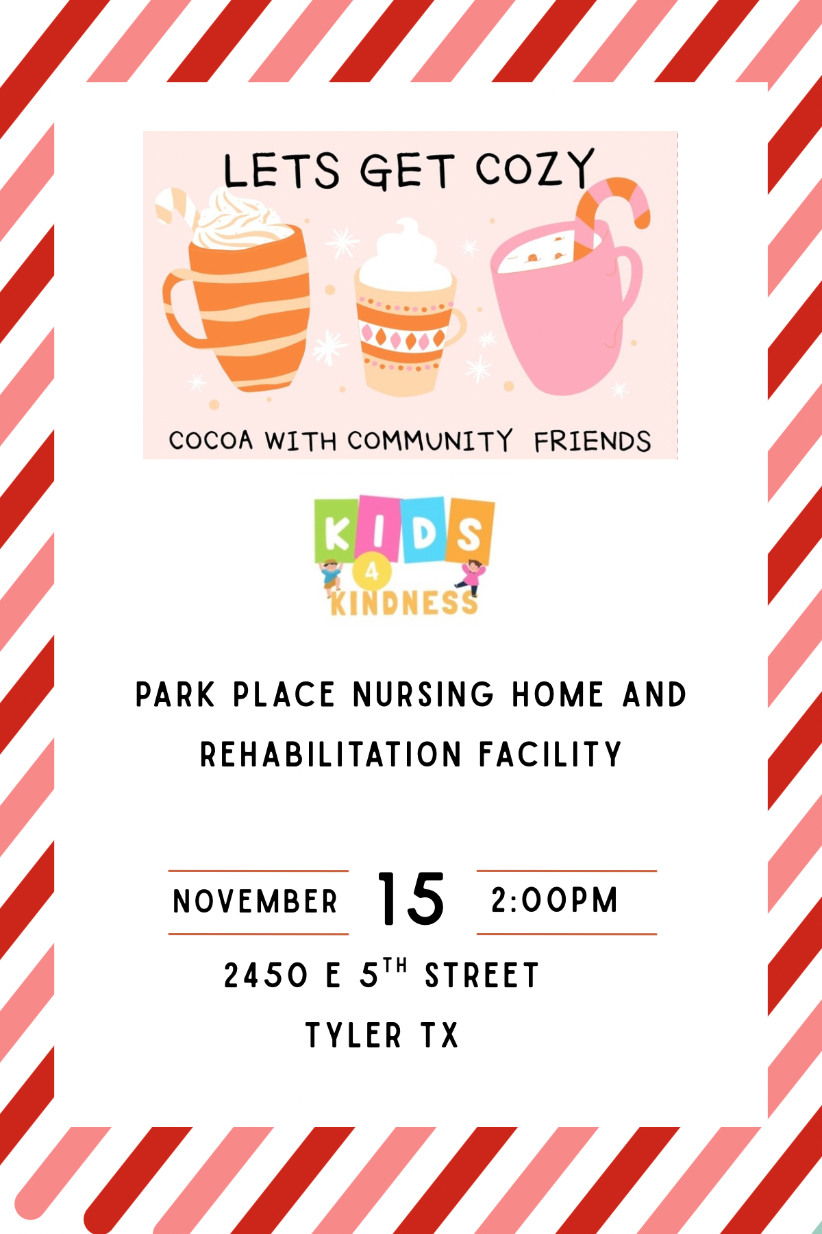 Kids 4 Kindness will be at Park Place nursing home and rehabilitation facility. Kids will serve residents cocoa and give out blankets. Please join us in giving joy to others
