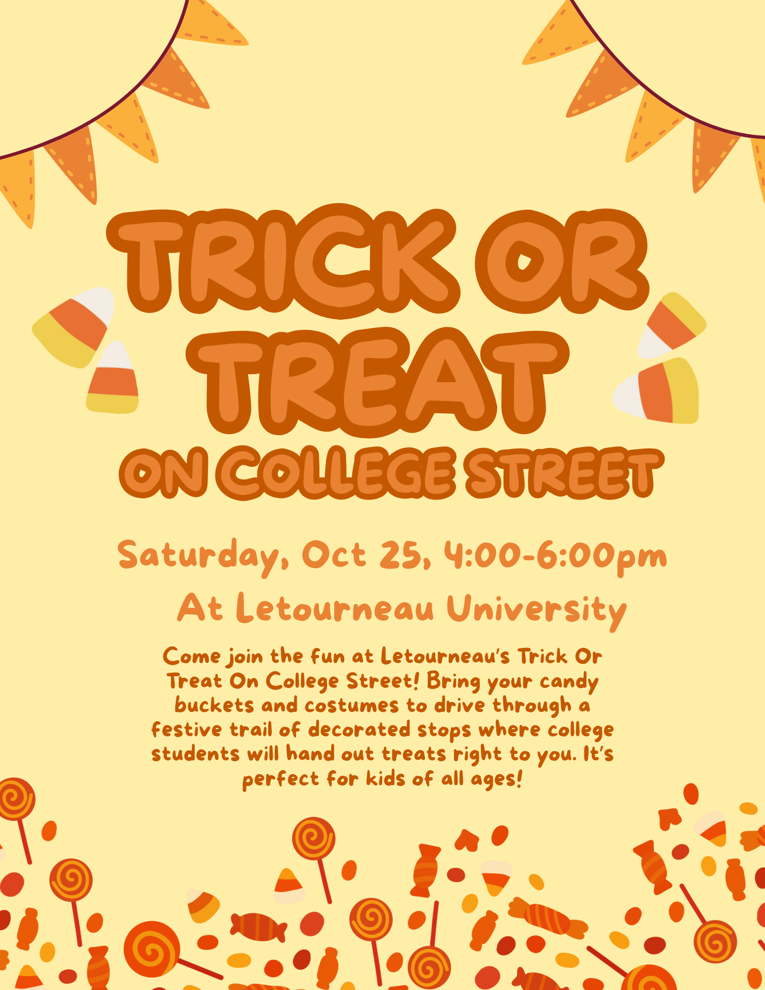 Come join the fun at Letourneau’s Trick Or Treat On College Street! Bring your candy buckets and costumes to drive through a festive trail of decorated stops where college students will hand out treats right to you. It’s perfect for kids of all ages!