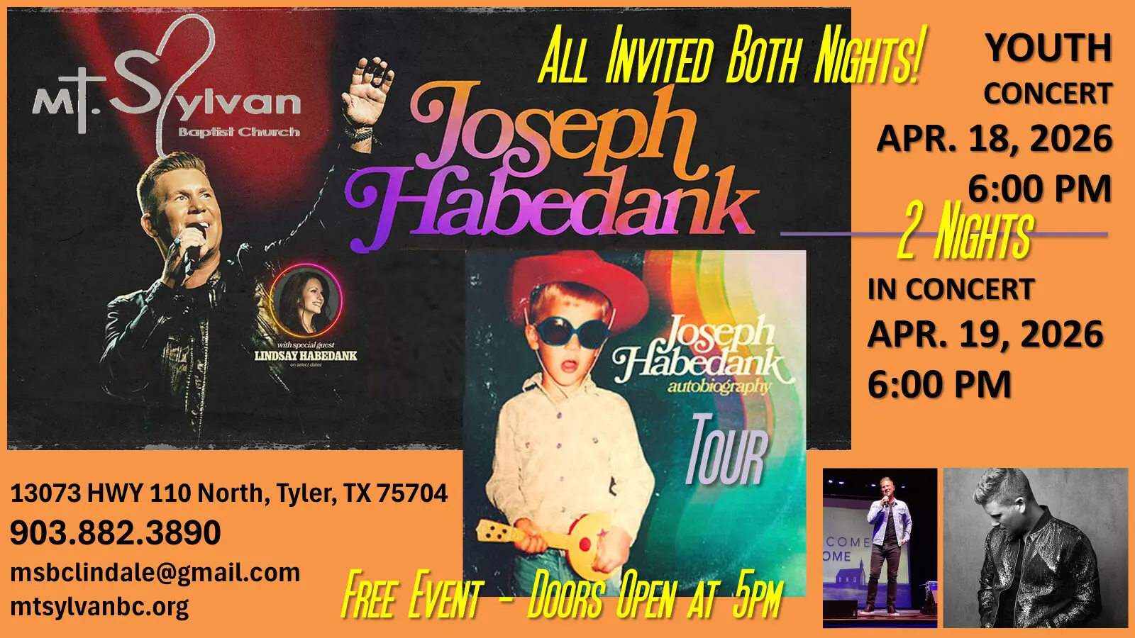Mt. Sylvan Baptist Church - Tyler 13073 Hwy 110N, Tyler, TX, United StatesChristian artist Joseph Habedank is no stranger to writing songs about real life. However, for the first time, Joseph is diving deep into his storytelling tendencies for an album that is, quite possibly, his most personal undertaking yet. Aptly titled autobiography, Habedank’s fifth studio effort effectively sets his own story to music. Habedank has been […]